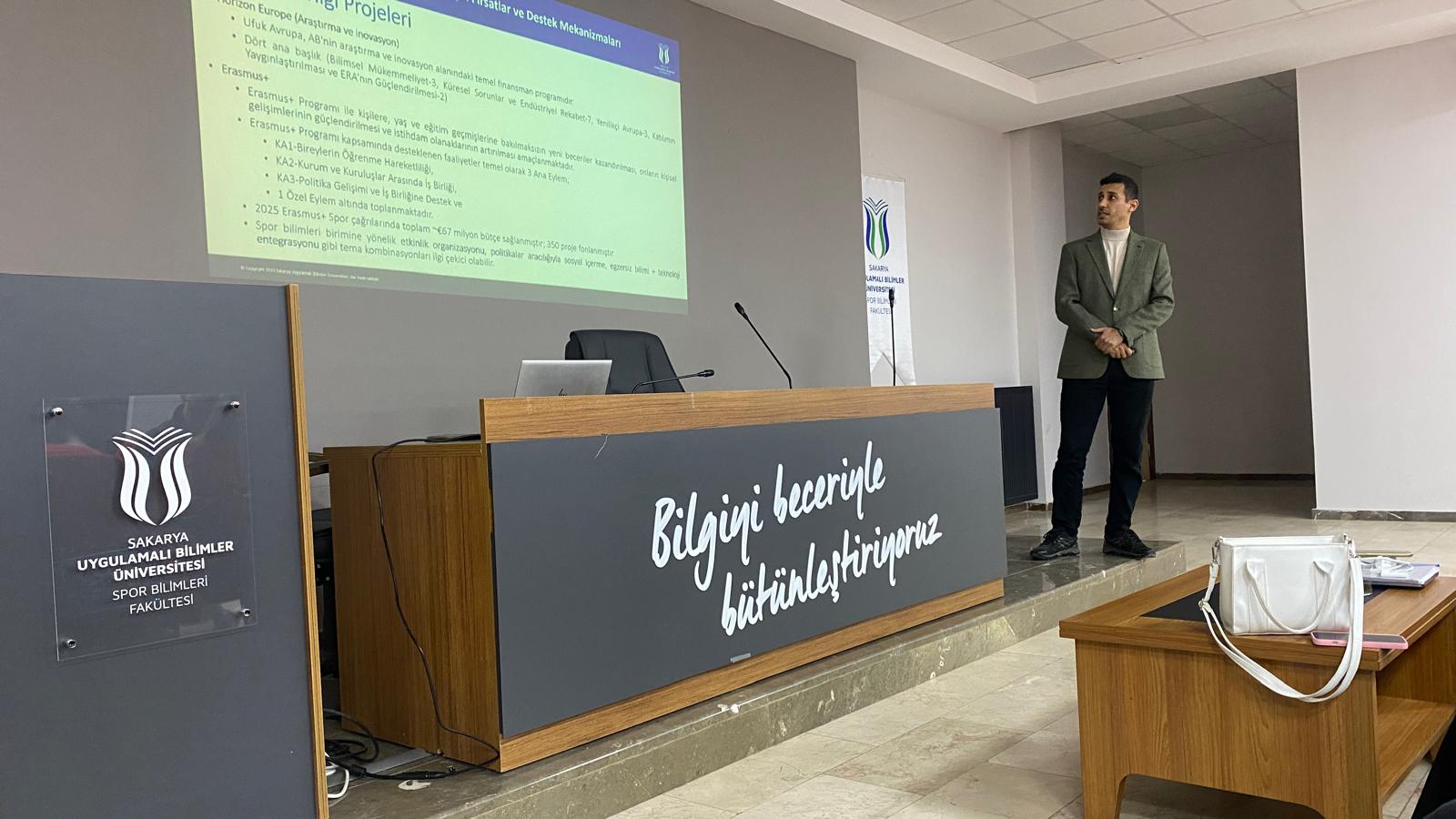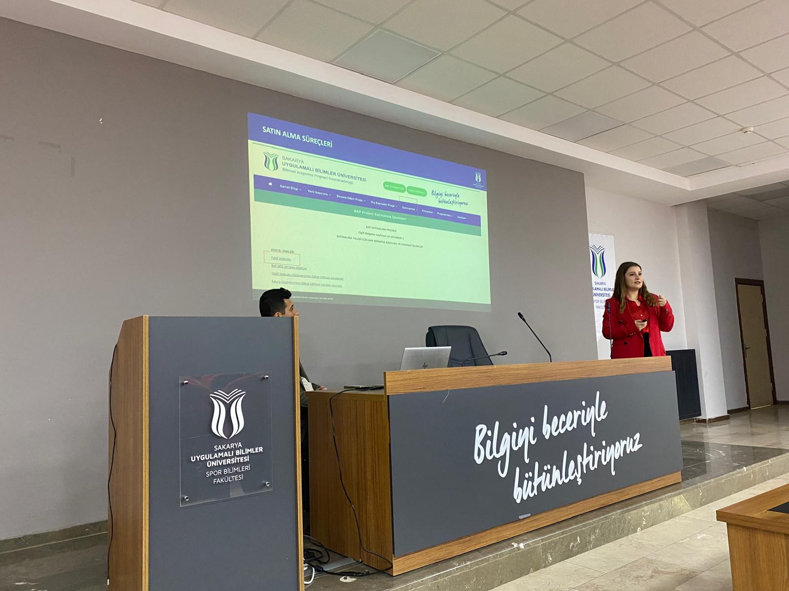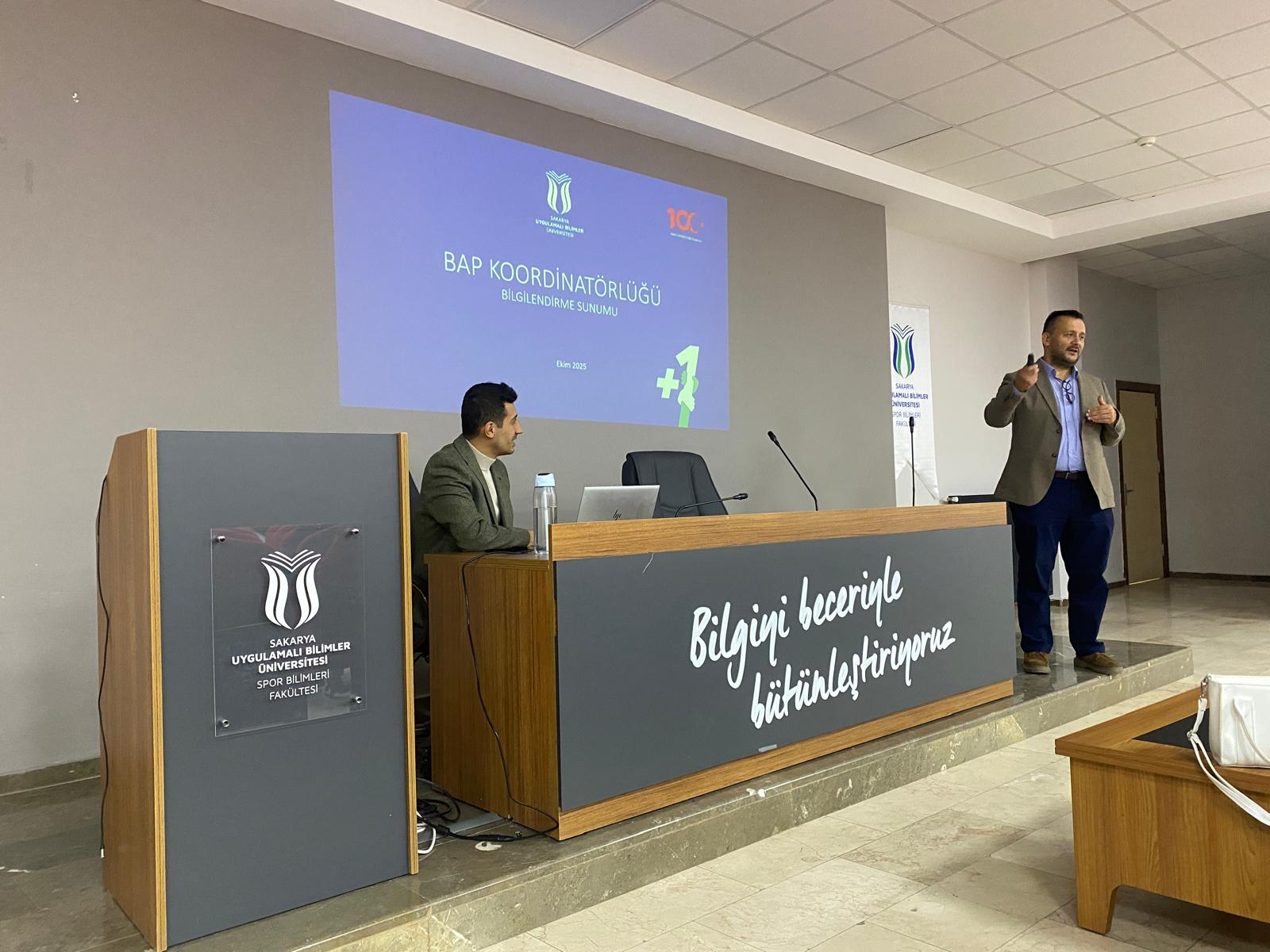 16.10.2025 tarihinde Bilimsel Araştırmalar Proje Koordinatörü Prof. Dr. Mustafa Can, satınalma ve idari birimimizden Öğr. Gör. Coşkun Cengiz ve Merve Balkaya ile dış kaynaklı projeler birimimizden Dr. Öğr. Üyesi Hüseyin Serdar Geçer tarafından Spor Bilimleri Fakültesi'nde öğrenci ve akademik personelimize yönelik sunum yapıldı. Sunumda 2025 yılı BAP destekleri ve akademisyenlerimizin başvurabileceği dış kaynaklı proje destekleri hakkında bilgi verildi.